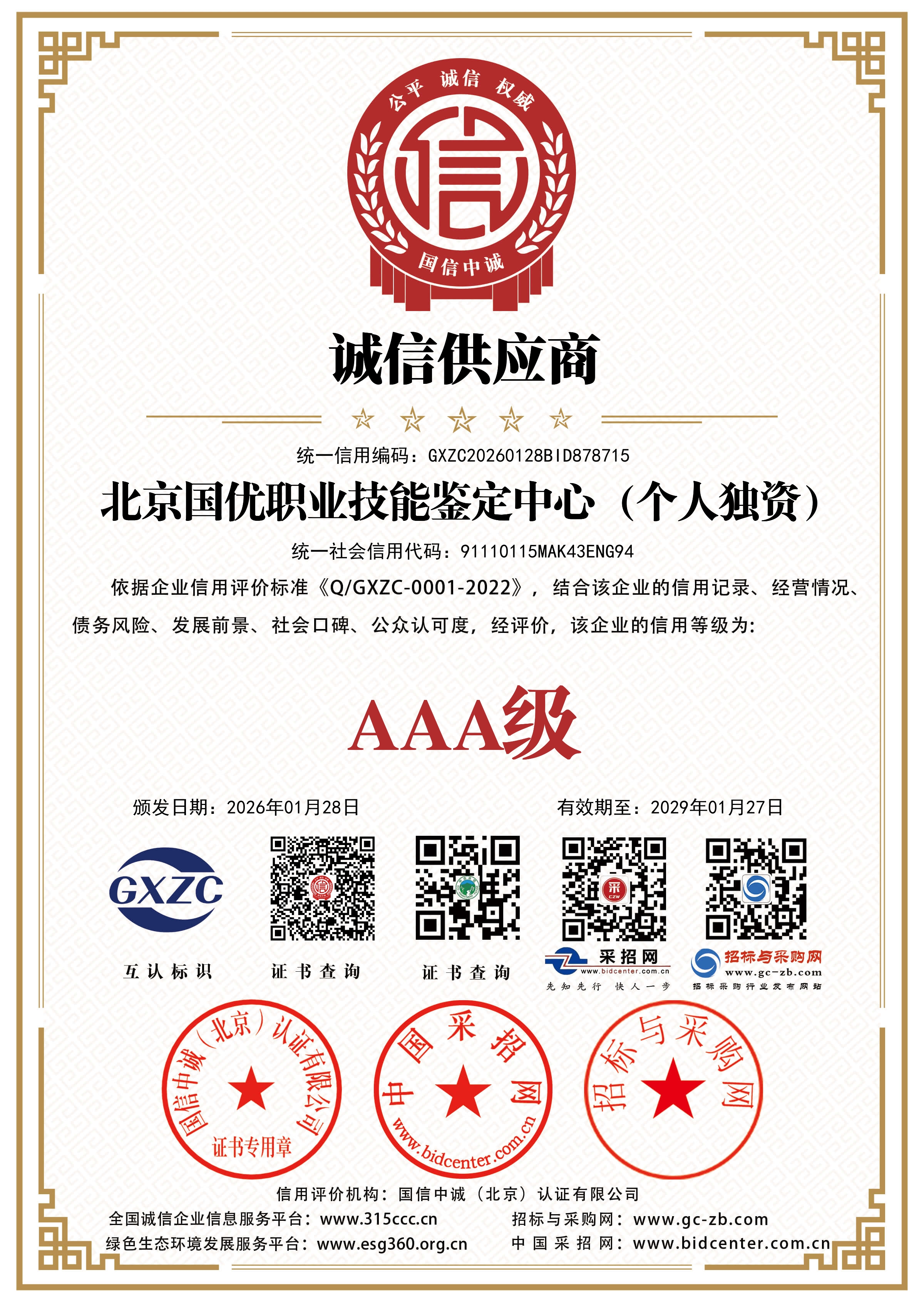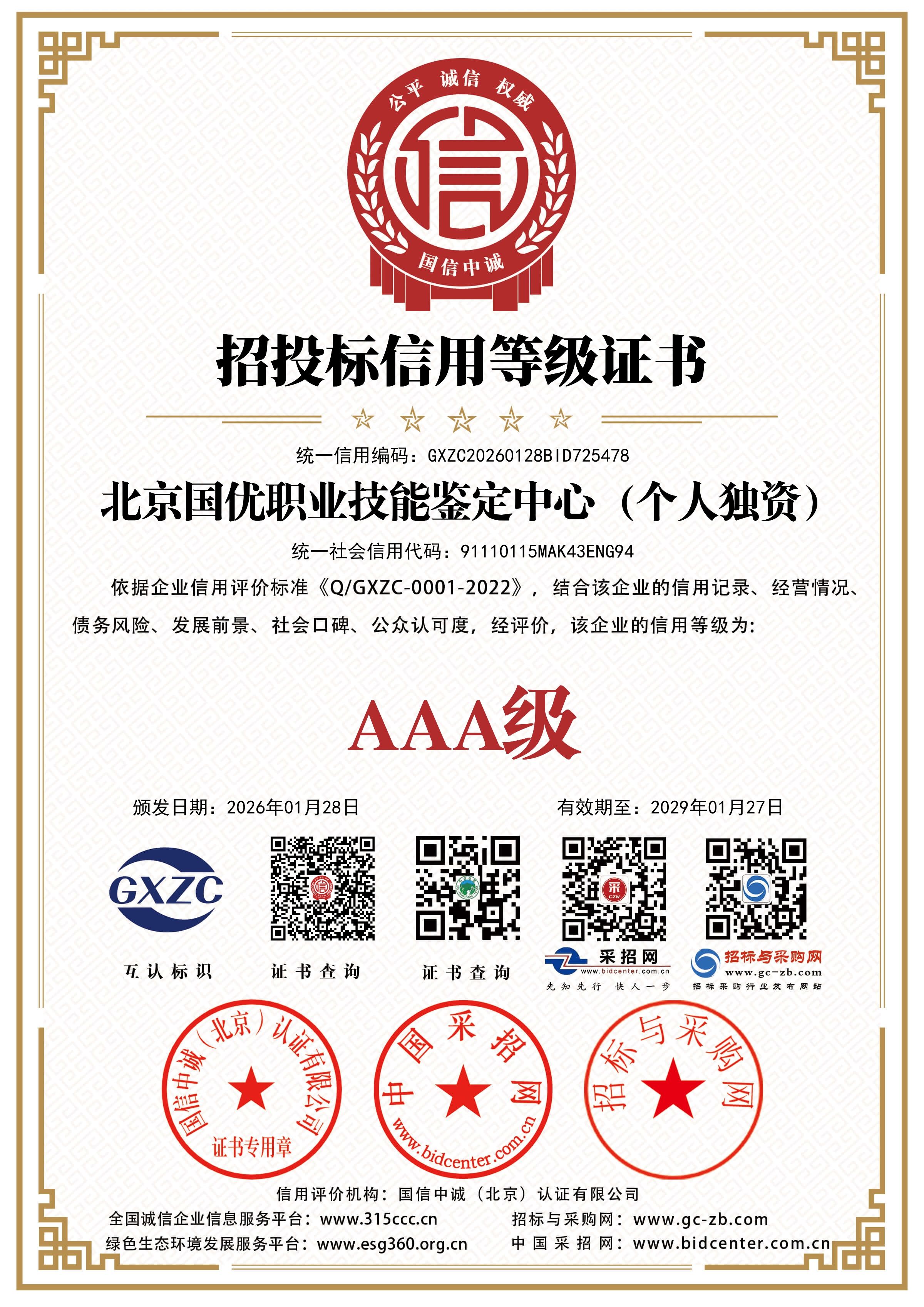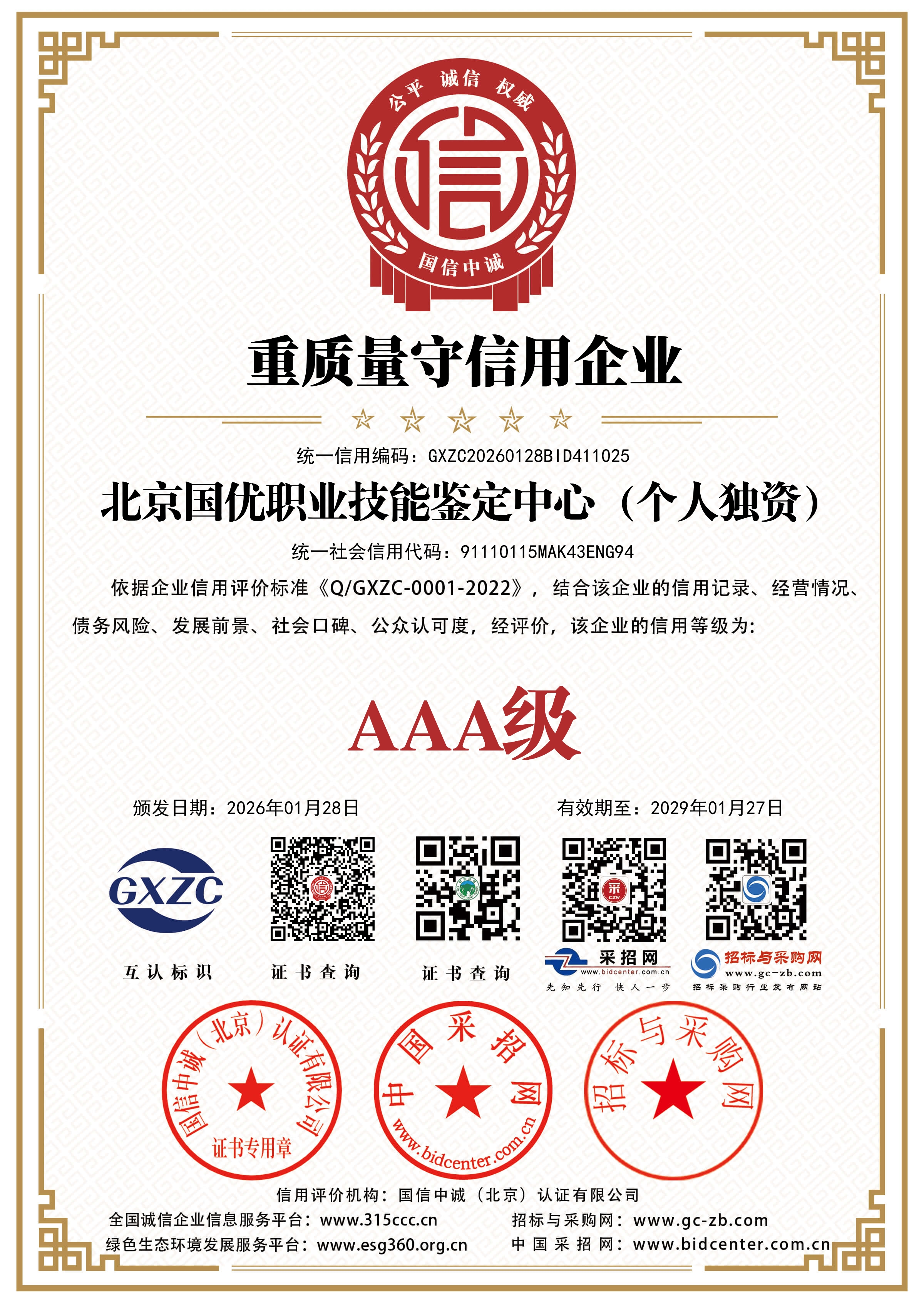 国优各项综合证书 分类:新闻动态 发布时间:2026-01-29 分享到: 微信扫一扫,然后点击右上角分享按钮 新闻链接已复制 快去粘贴给你的好友吧! 我知道了 上一篇: 关于本中心2026年春节放假的通知 下一篇: 热烈庆祝《中国人力资源职业能力人才评价中心》官网正式开通 更多推荐 郑重声明“关于本中心培训结业证书的说明” 2026-03-02 北京:人社事业“十五五”规划征来360条“金点子” 2025-12-11 近日,北京市人力资源和社会保障局举办的“智汇人社‘十五五’ 共谱发展新篇章”主题征文活动评选结果正式揭晓。 教育部发布职业教育国家教学标准体系 2025-12-07 职业教育行业深度分析 2025-12-07 发展职业教育 培养大国工匠 2025-12-07 道路运输从业资格平台考生操作手册 2025-11-15